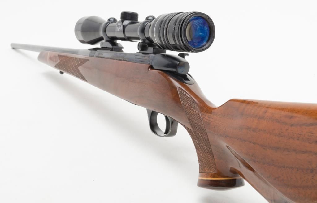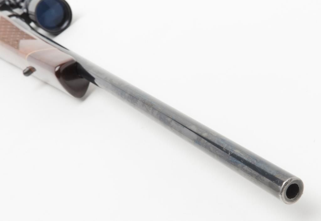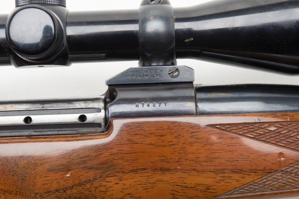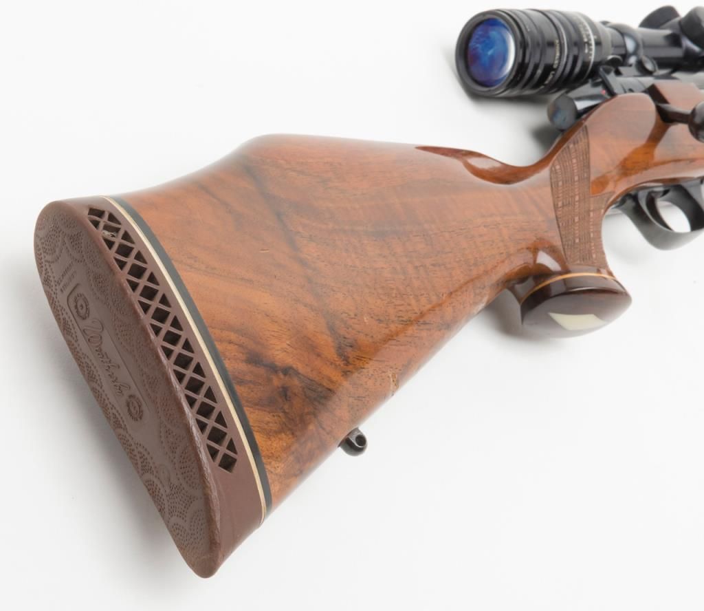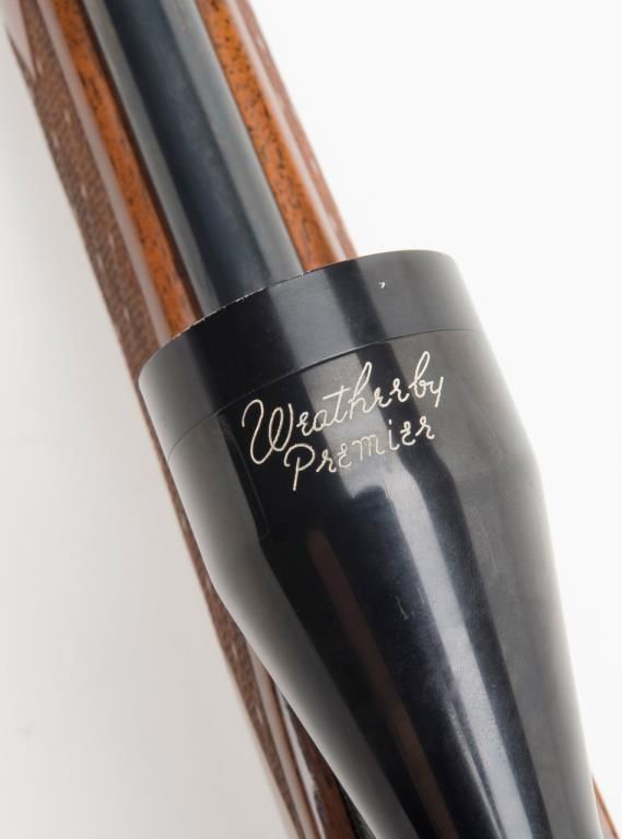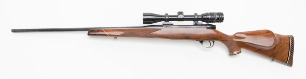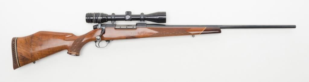 Weatherby Model Mark V bolt action rifle, .300 Magnum caliber, Serial #H74277. The rifle is in overall very good condition with a 24” barrel. The barrel retains the majority of its polished blue finish with only minor mars from use. Theaction shows most its blued finish with losses at the magazine and trigger guard. The finely checkered wood stock is in very good condition with small marks and compressions consistent with use, a rosewood tip and ventilated rubber buttpad. The bore is very good, action crisp and markings sharp on this Japanese manufactured Weatherby. The rifle is topped with a set of Buehler mounts and a Weatherby Premier 3x9x40 variable power scope with clear optics.(Modern/PPT). Est.: $400-$600.