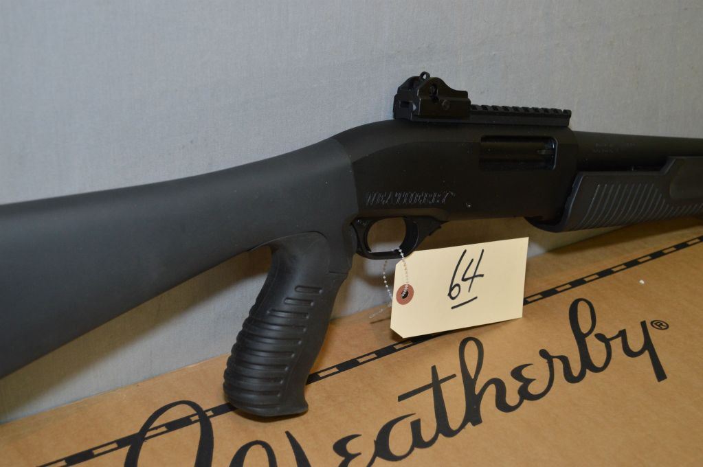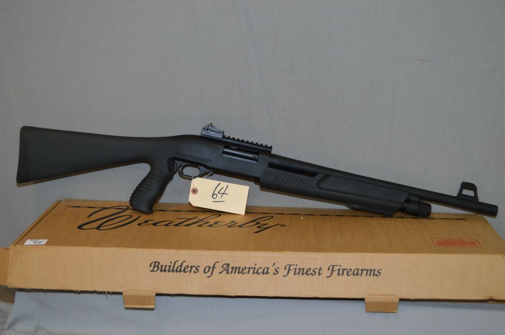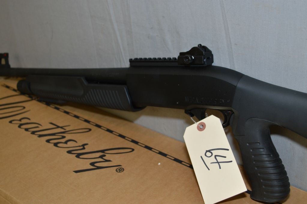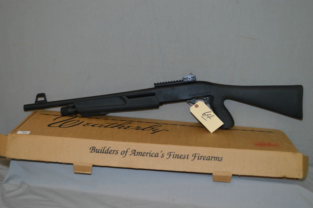 Weatherby Model PA - 459 .12 Ga 3" Pump Action Shotgun w/ 20" w/ ported muzzle break [ appears as new, test fired, flat black finish, barrel sights on 6" back rail, composite combination pistol grip butt stock, w/rubber recoil pad, also composite forend w/ 3" under rail c/w box ] Ser # AK01234