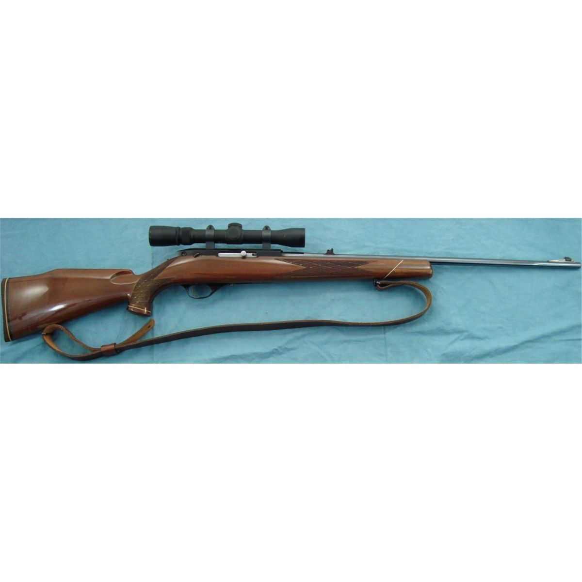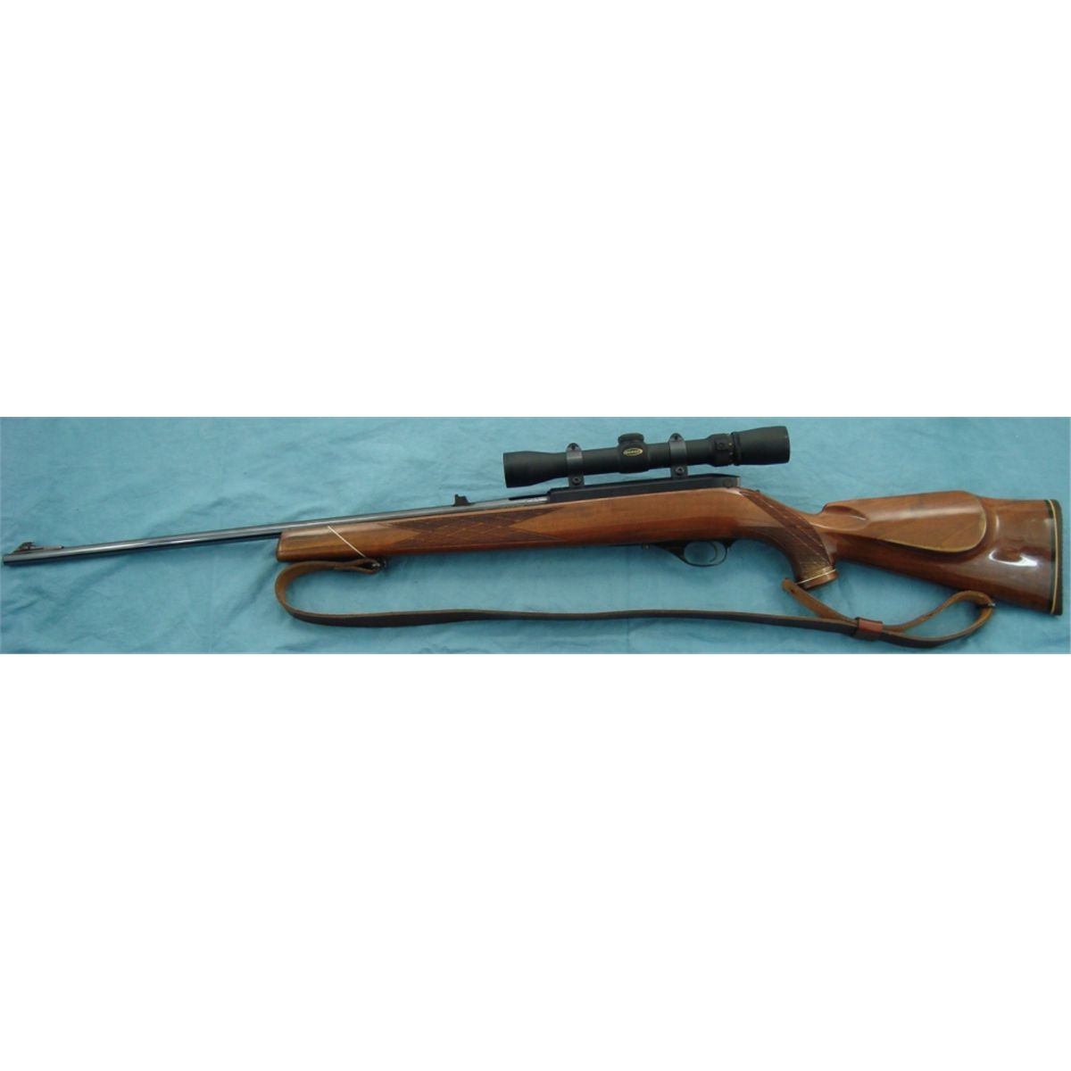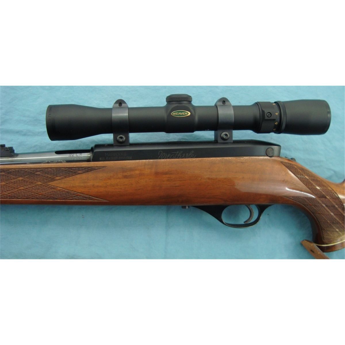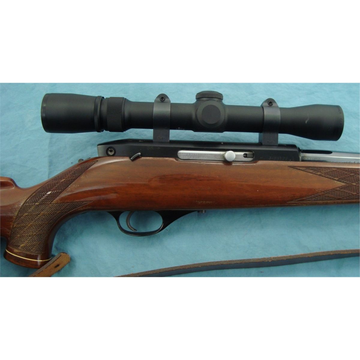 #J-29122; 22 cal. Shows good original blue w/some spots of surface rust along bbl. channel. Stock is in good condition w/some rub marks from use. Complete w/newer Weaver 2.5x7 power 22 cal. scope.