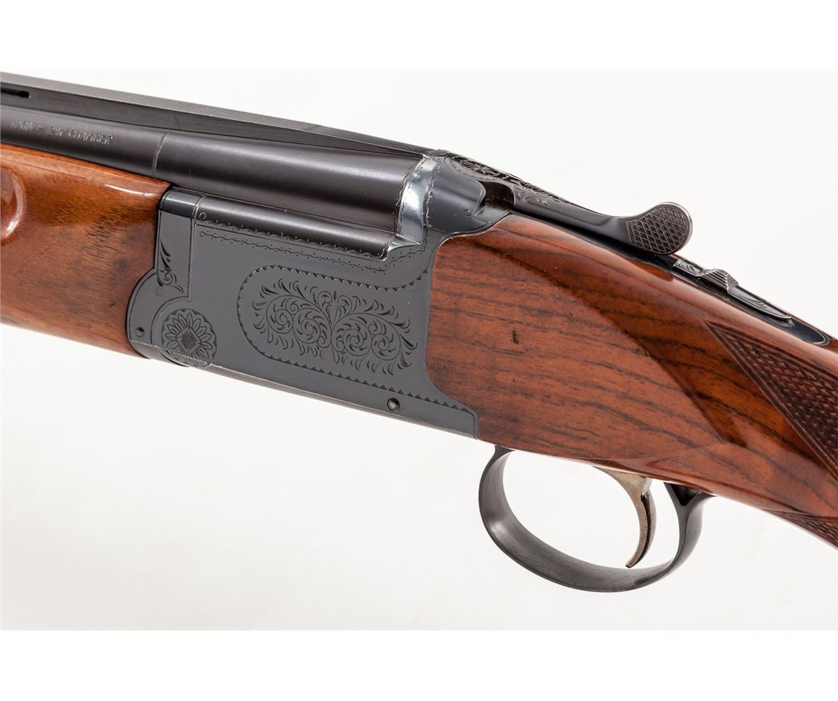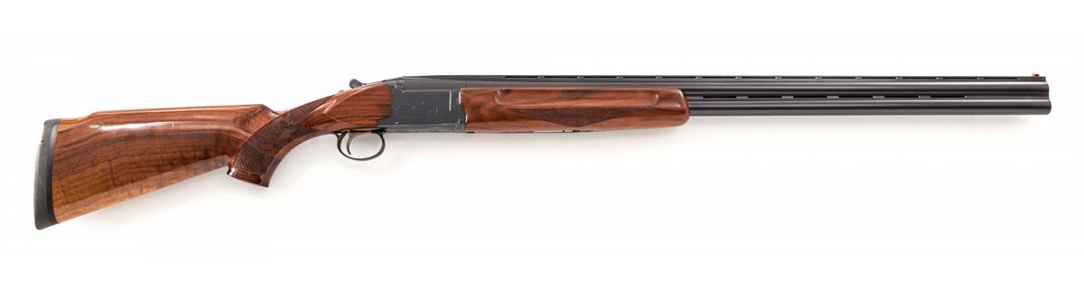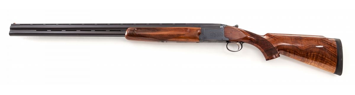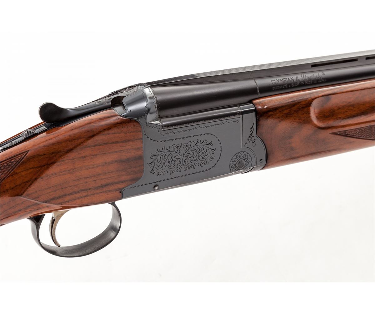 Weatherby Olympian Over/Under Shotgun, #W000383, 12 ga., 29-3/4'' vent rib barrels for 2-3/4'' shells choked Mod./IC, blue finish, lightly roll-engraved decorator receiver, checkered walnut stock and forend, with Decelerator black rubber butt pad and red & silver bead sights. Made in Japan. Condition is fine to near excellent showing light to just moderate field use as minor thinning at balance point and light scuffs to stock. Action is crisp, bores are bright. Length of pull to end of pad: 14-1/4''. Est.: $750-$1,000. (Modern)