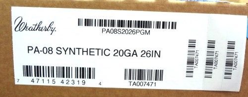 Weatherby PA-08 Synthetic 20 Gauge Shotgun. Finish - Matte black. Action - Pump action. Stock - Black Synthetic Stock. Capacity - 5+1. Chokes - Multi-choke (full, mod, IC). Safety - Cross bolt safety. Sights - Brass front bead. Barrel Length - 26" chrome-lined barrel, vent rib. Weight - 6.5 lbs. Features - drop out trigger system, chrome plated bolt. EST. $400-450