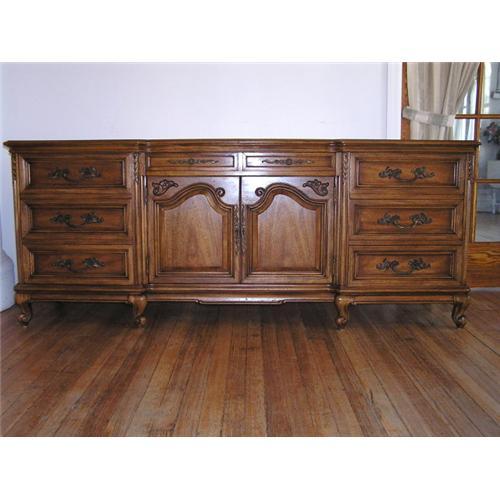 Gorgeous weathered mahogany triple dresser with cabriole legs by furniture maker Metz. Great scuplted detail, elegany handles, very well made. Excellent condition. Works well as a buffet or server. Also available are two matching end tables.