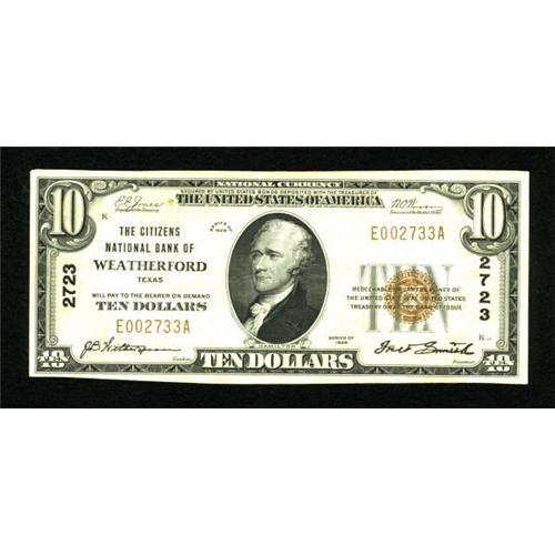 <B>Weatherford, TX</B></I> - $10 1929 Ty. 1 <B>The Citizens NB</B></I> Ch. # 2723<BR> An attractive issue from a locale just west of Ft. Worth. <B>Very Fine.</B></I><BR><BR><b>Shipping:</b> Coins & Currency (<a target="_blank" href="http://www.heritageauctions.com/common/shipping.php">view shipping information</a>)