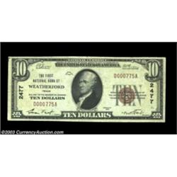 Weatherford, TX - $10 1929 Ty. 1 The First NB Ch. # 2477A nice example with signatures of Geo. Fant and M.O. Fant. Fine-Very Fine. Important notice: Heritage usually auctions material at the rate of 200-250 lots per hour. On some occasions eBay Live bid software or the Internet may not be able to keep up with the pace of the auction. We recommend placing a realistic absentee bid now as insurance to avoid disappointment. Occasionally the auctioneer may eliminate or reject an eBay Live bid, and the auctioneer may also reopen a lot after the close of the eBay live bidding (usually because we missed an audience bid), and may reject your bid even if it shows you as the winning bidder. By bidding via eBay Live, you agree that Heritage may award the lot to another bidder at its sole discretion under the circumstances described above or any other reasonable circumstances. Also please note that all Heritage lots purchased through eBay Live carry a 20% Buyer's Premium. Please make sure you read the Terms and Conditions before you bid.