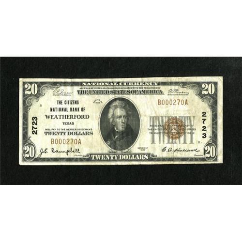 <B>Weatherford, TX</B></I> - $20 1929 Ty. 1 <B>The Citizens NB</B></I> Ch. # 2723<BR> A bright example from this ever popular location. <B>Very Fine</B></I>.<BR><I>From The Rolling Plains Collection</B></I><BR><BR><b>Shipping:</b> Coins & Currency (<a target="_blank" href="http://www.heritageauctions.com/common/shipping.php">view shipping information</a>)