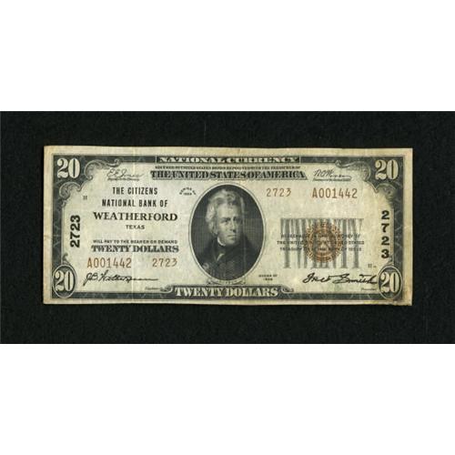 <B>Weatherford, TX</B></I> - $20 1929 Ty. 2 <B>The Citizens NB</B></I> Ch. # 2723<BR> This was one of the earlier national banks chartered in Texas when Weatherford was on the edge of the frontier. This note is one of only four Type 2s in the census. There is wallet staining on the back. <B>Fine</B></I>.<BR><BR><b>Shipping:</b> Coins & Currency (<a target="_blank" href="http://www.heritageauctions.com/common/shipping.php">view shipping information</a>)