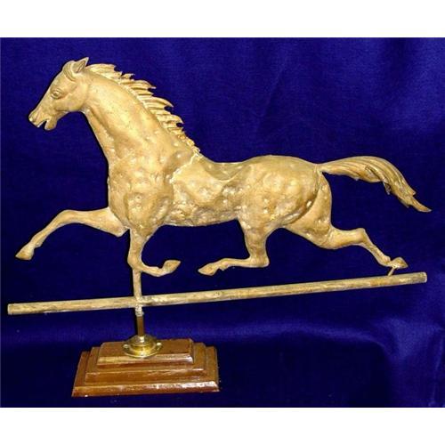 19th century gilt copper swelled body trotting horse weathervane with an applied molded zinc head, very nice flowing form and wind wiped maim in the manor of A. L. Jewell, some normal wear along with b-b gun pelts, traces of the original gilding, overall a fantastic piece of 19th century American folk art measuring 17 inches height (the vane without the base) 23 inches height with the base.