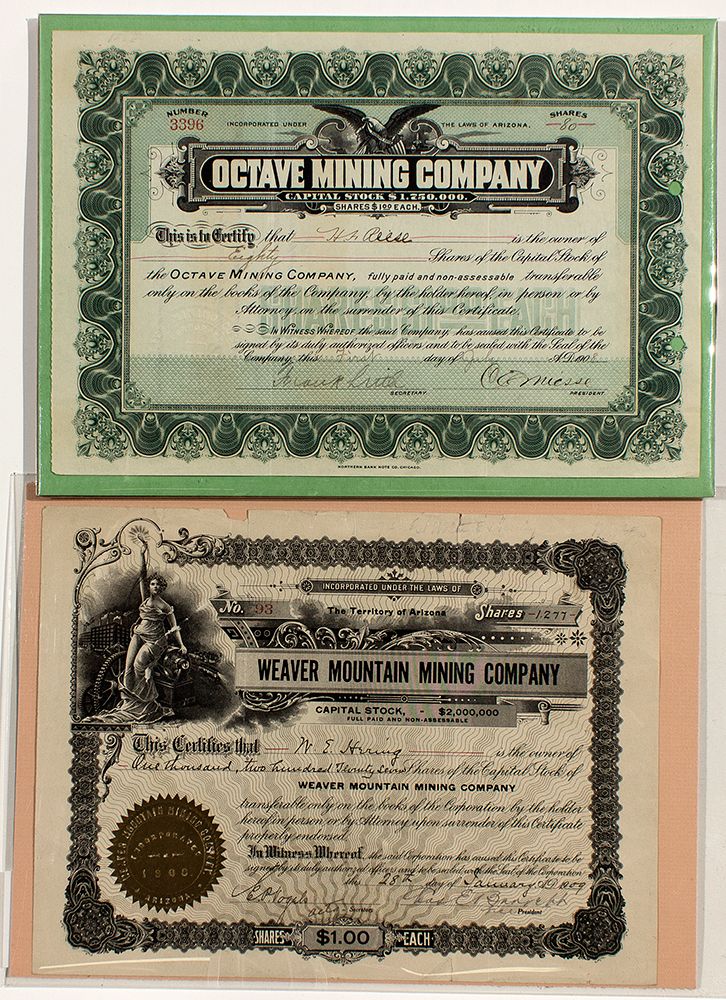 1908 This is a lot of 2 stocks. 1) Weaver Mountain Mining Co. It is stock number 93 issued to W.E. Hering for 1,277 shares on January 28, 1909. It measures 11" x 8.10" and has some wear. Not cancelled. 2) Octave Mining Co. It is stock number 3396 issued to H.W. Reese for 80 shares on July 1, 1908. It measure 11.05" x 7.65" and has some wear. Bud Bassett Collection - HKA#65490