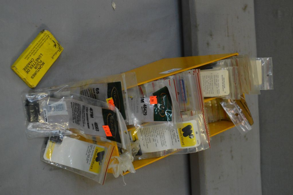 Weaver Yellow Metal Store Counter Top Stand with large assortment of bases, etc. [ appear new in pkgs ]