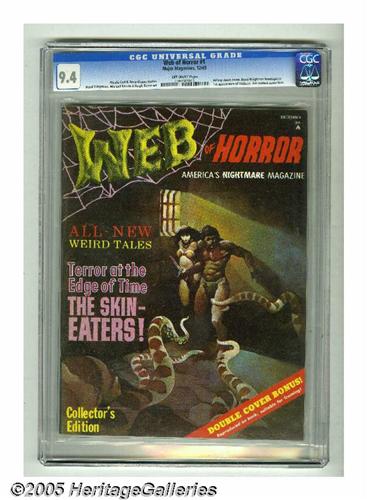 <B>Web of Horror #1 (Major Magazines, 1969) CGC NM 9.4 Off-white pages.</B></I> The publisher Major Magazines gave Warren some early competition in the black-and-white horror field with this short-lived title. There's certainly impressive young artistic talent to be found in the debut issue, with Jeff Jones (cover), Bernie Wrightson, Mike Kaluta, and Ralph Reese all contributing. Making his first appearance was Webster, the spider who "hosted" the mag. Overstreet 2005 NM- 9.2 value = $100. CGC census 1/05: 2 in 9.4, higher. <I>From the collection of Chris Bell.</B></I>