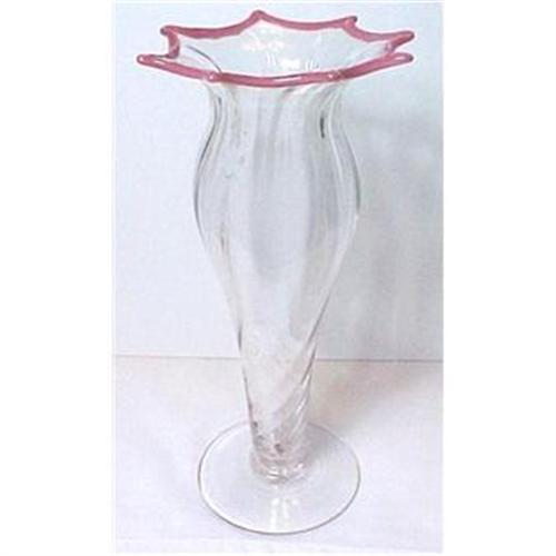 Webb art glass blown crystal signed antique vase. This antique Webb art glass crystal vase has a beautiful azalea pink applied threaded glass rim on its multi-pointed top. Blown glass body of the vase is swirled, its ribs expanding towards the top. Underside of foot bears the 1906-35 Webb etched script signature that was used on crystal. Vase stands stands 10 inches H., 5 inch diam. across top. . This crystal vase exemplifies fine and delicate craftsmanship for which Webb is renowned. No chips or cracks, underneath foot with expected wear. Excellent condition from a private estate. (white spots in photos are from light glare).