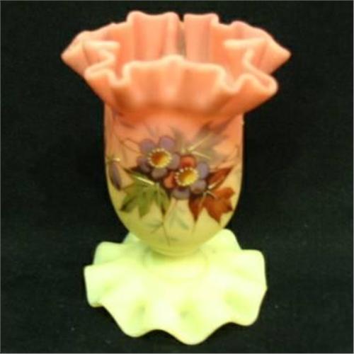 Webb decorated Burmese ruffled base and top vase. Excelent condition, 3 3/4" tall, 1870-1890.