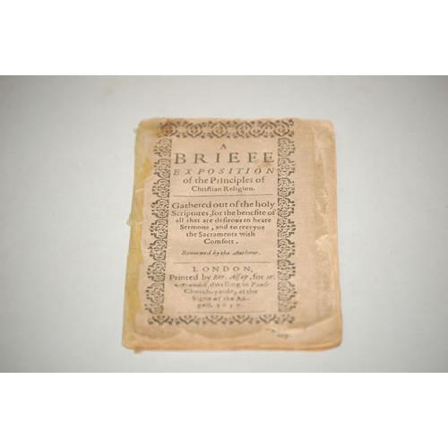 Webb. G. A Briefe Exposition of the Principles of Christian Religion. London: Printed By Ber. Alsop, for W. Arundell, Dwelling in Pauls Church-Yarde, at the Signe of the Argell, 1617. 24mo - over 5" - 5¾" tall. Soft Cover. Fair to Good condition. SCARCE. Unpaginated. Bordered title, with 32 leaves (includes cover pages). Front cover has edge chips, cellophane over backstrip (peeling off). Title continues: Gathered Out of the Holy Scriptures, for the Benefite of All That are Desirous to Heare Sermons, and to Receyue the Sacraments with Comfort.