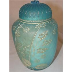 Webb blue enameled diamond quilted covered ginger jar. Signed with berry punnel. 6 1/2" tall.