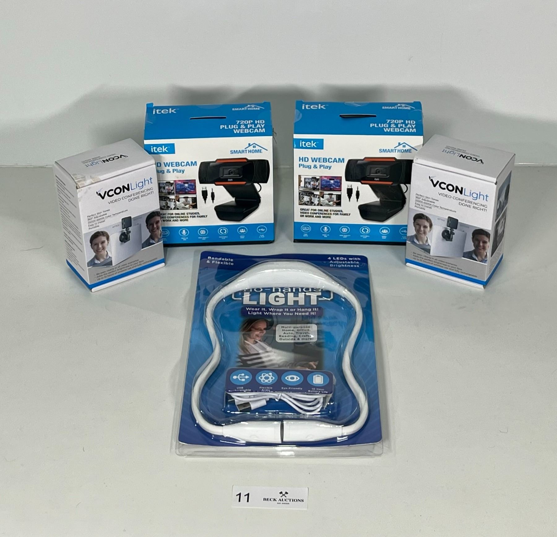Two HD webcams, two attachable laptop lights, and and one neck light.
