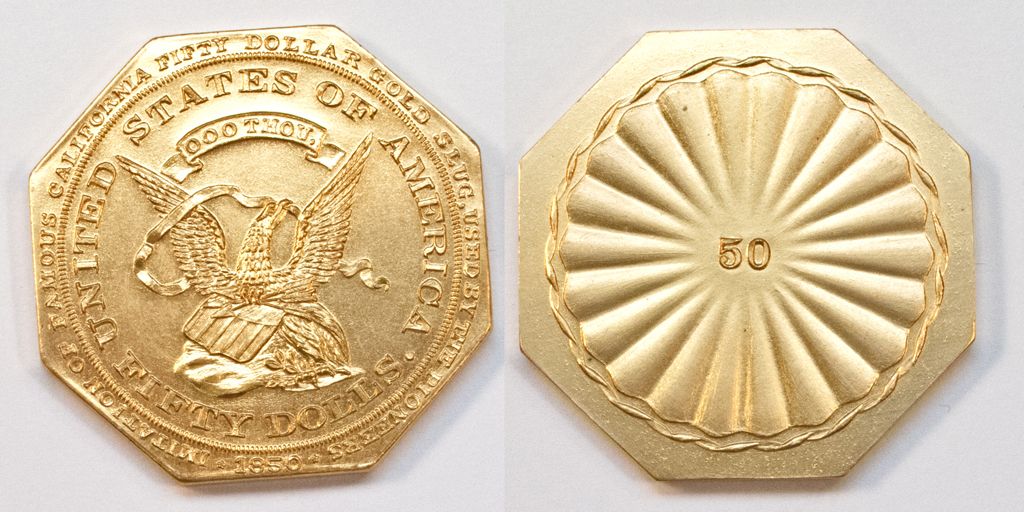 Gem Brilliant Uncirculated Slug Facsimile -1850 with Ray reverse. OOO THOU in the banner above eagle's head.