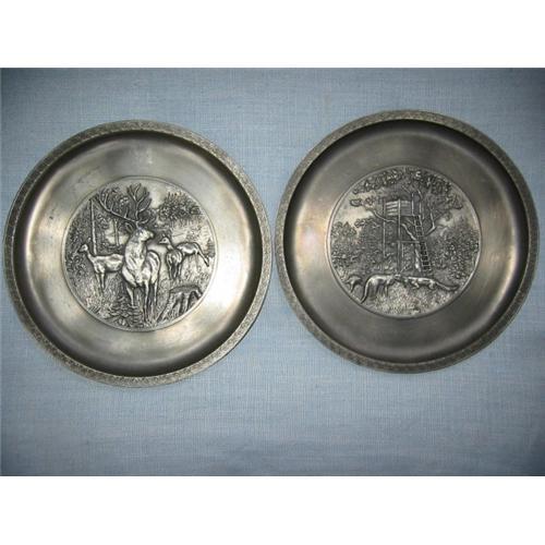 These amazing pewter plates are decorative and has multiple symbol and marks, made of 94% zinn. They are highly detailed with Animal, figures and nature motif and each 8.5 inch in diameter. They are in great vintage condition and imperfections. Each plate would make a magnificent decorative design. In groupe, are perfect wall design.