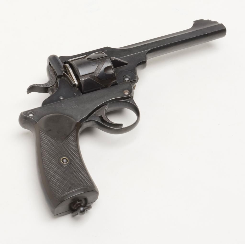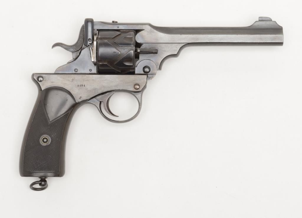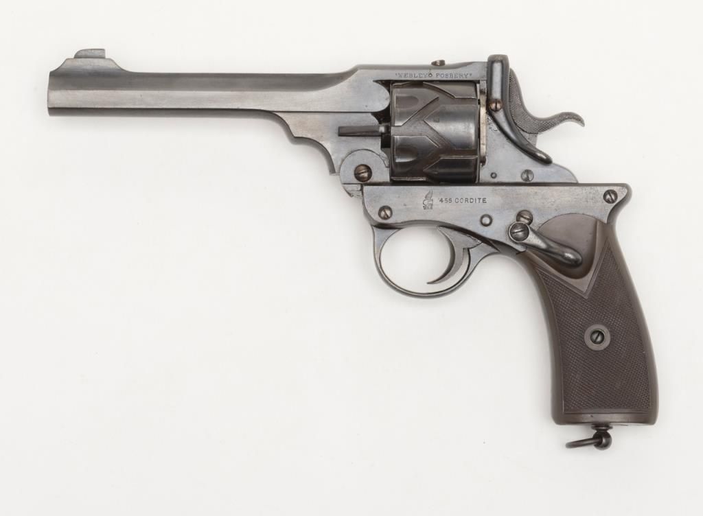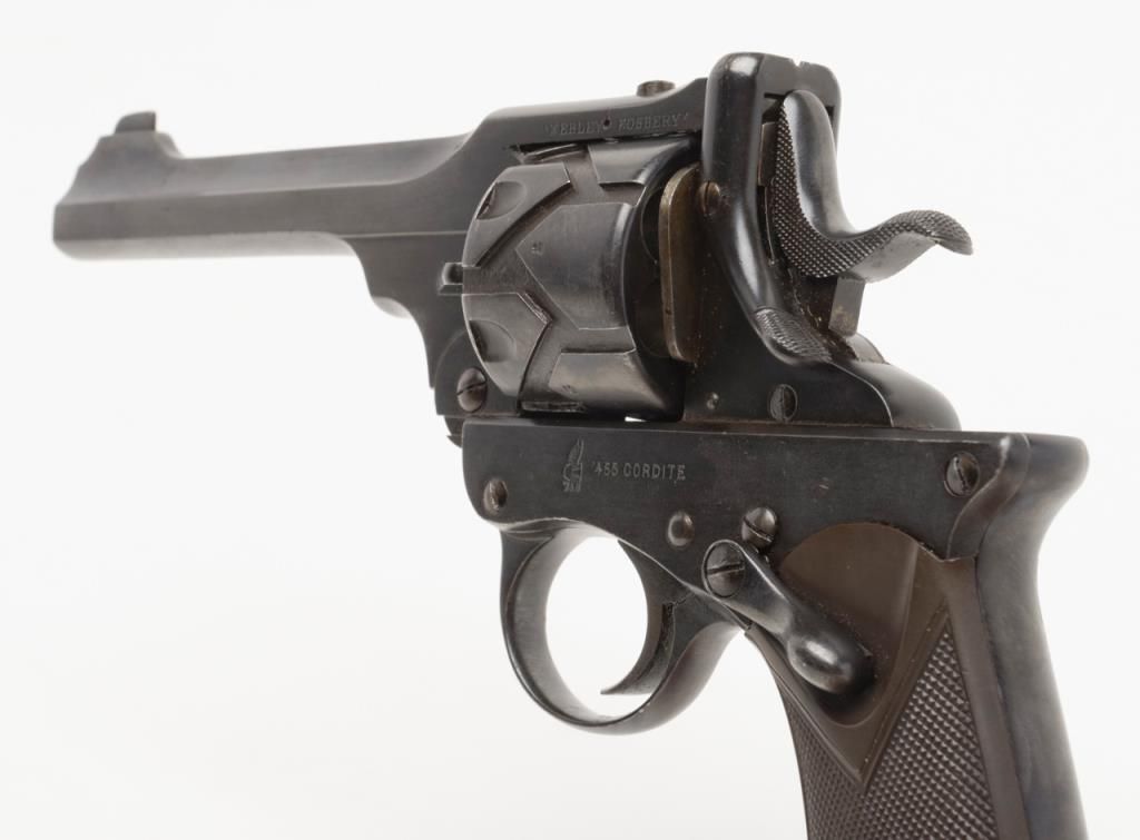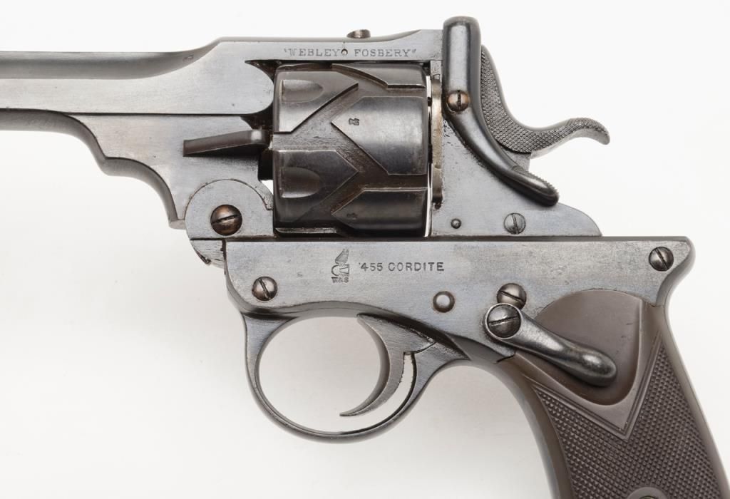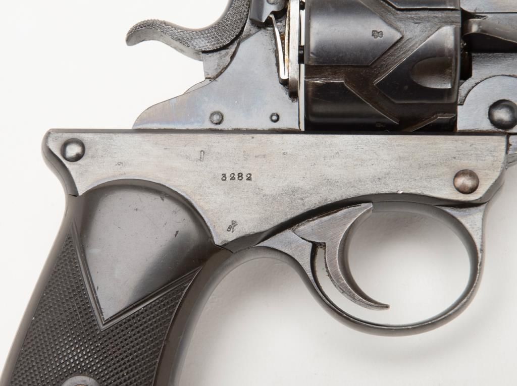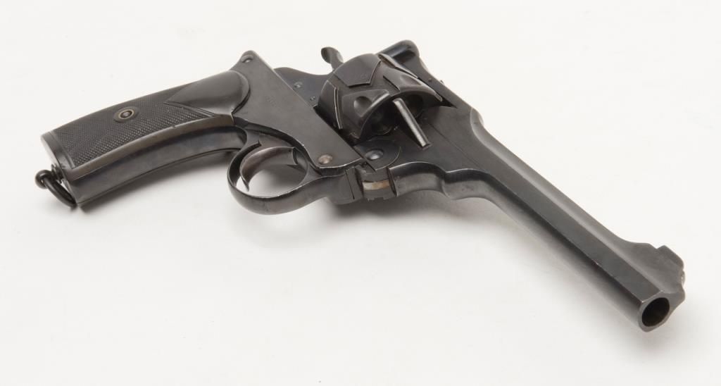 Webley Fosbery double action semi-automatic revolver in .455 caliber, serial number 3282 on right side of frame. The revolver shows an excellent English or factory quality refinish with very sharp edges, crisp interior with excellentto near mint bore. The finish is of a mat or military color of the type Webley put on military contract arms. Several parts also have been left unfinished or in the bright like a factory finish. The grips are very good plus and all markings are sharp and crisp along with British proofs. The front of the barrel shows a number 282 as does the back of the cylinder. There is a large engraved number on instrap 3655. The Webley Fosbery is one of the rarest and most desirable oddity arms ofthe early 20th-century along with the Mauser zigzag and they have both been sought after by collectors. Est.: $6000-$12,000