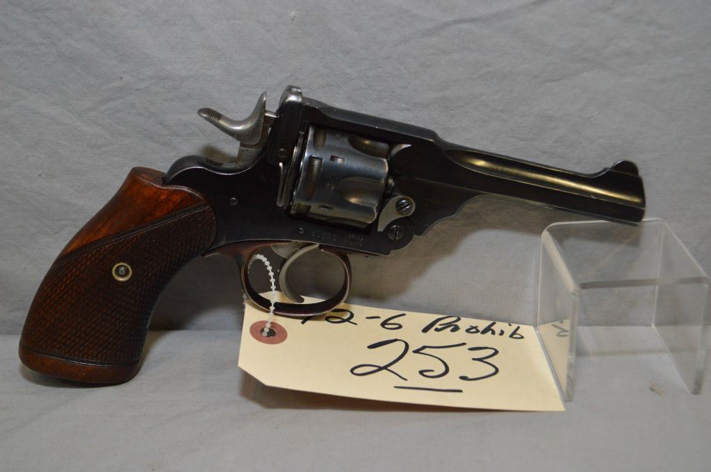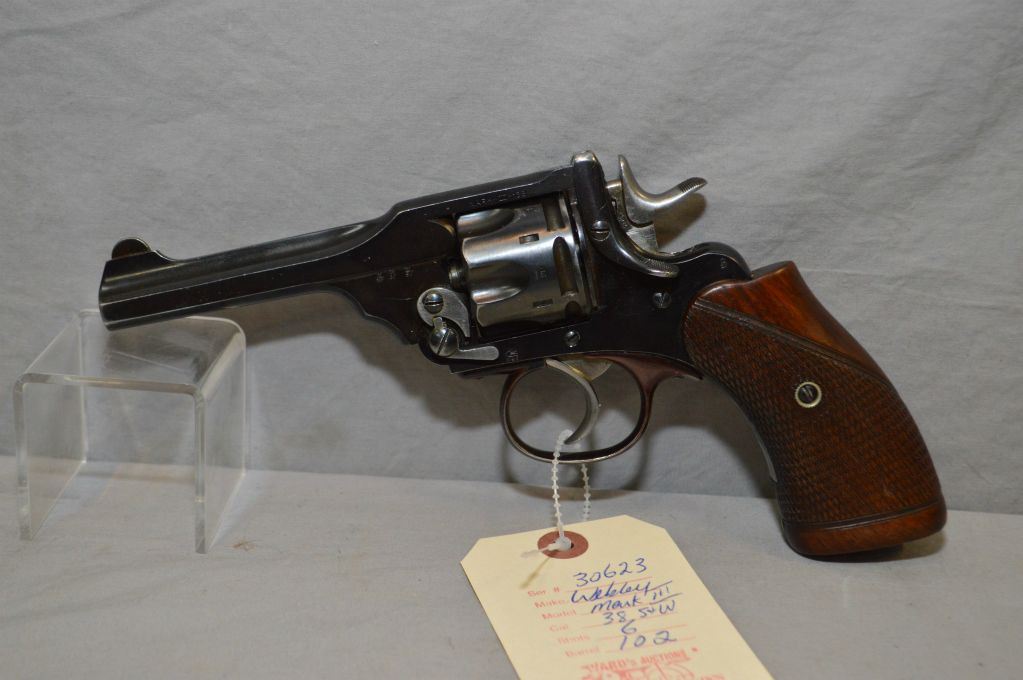 Webley Mark III .38 S & W Cal 6 Shot Revolver w/ 102 mm bbl [ appears v-good, blued finish with slight muzzle wear, trigger guard plum colored, checkered walnut grips ] Ser # 30623 12- 6 Prohib EXPECT DELAYS IN TRANSFER Cert # 17325889
