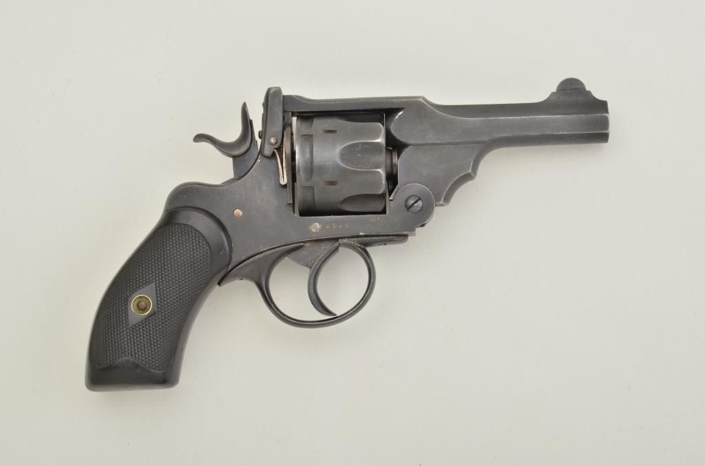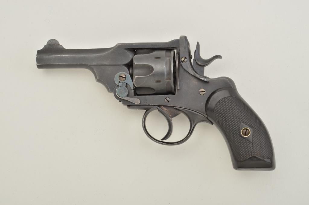Webley Mark III DA revolver, .38 cal., 3” barrel, parkerized finish, checkered hard rubber grips, #924 in overall very good condition showing the majority of its finish, very good bore, action, markings and grips. Est.: $250-$500.