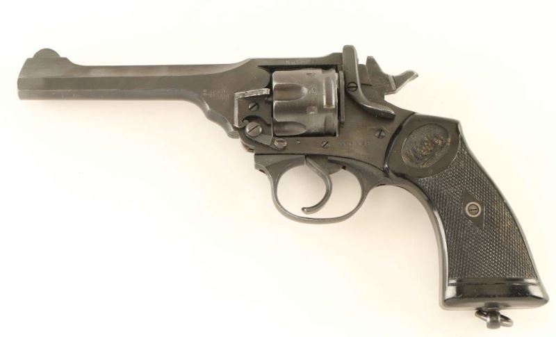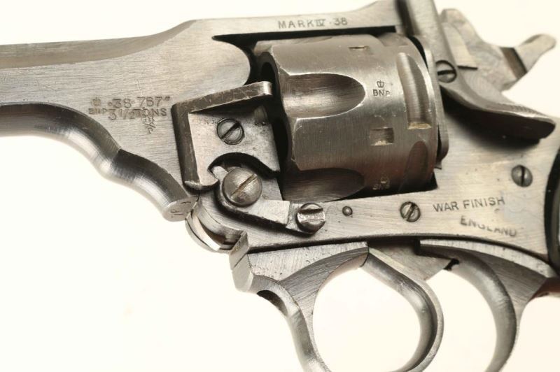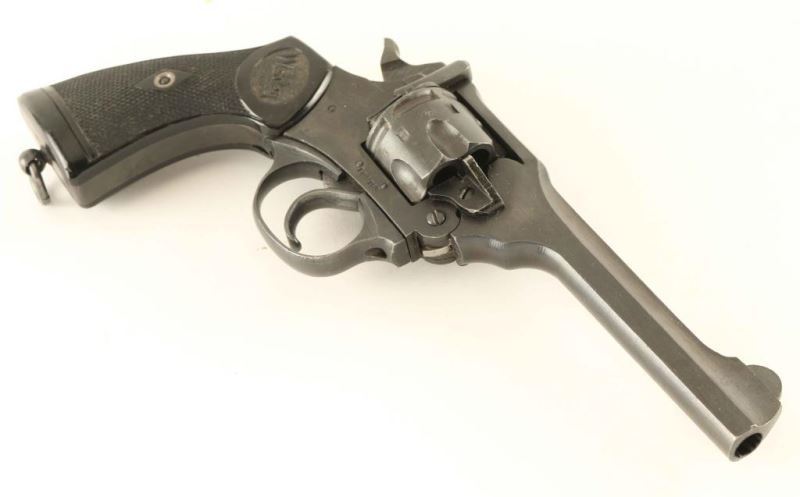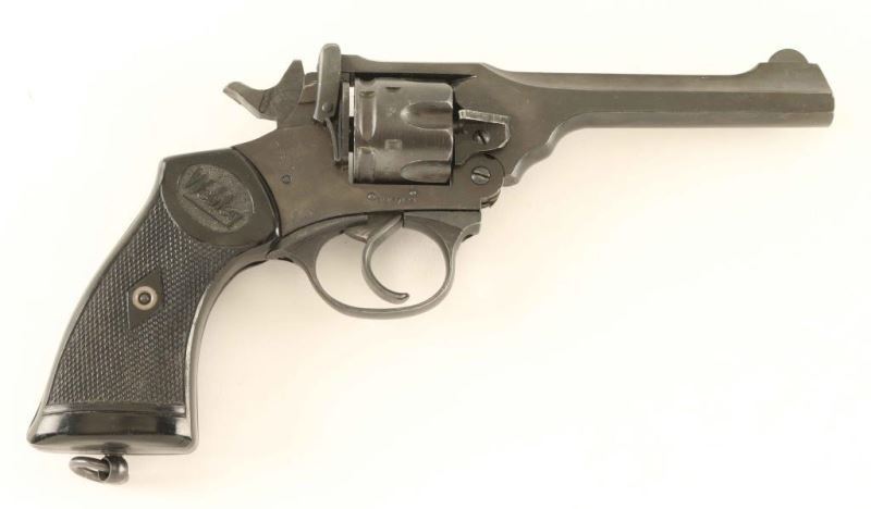 WWII Era British military top-break double action revolver, chambered for the British Revolver Mk 1 .38/200 cartridge. Features a blued "WAR FINISH," 5" barrel, raised round blade front sight, square notched rear sight on the barrel catch, fluted six-shot cylinder, automatic extractor, smooth trigger, serrated wide hammer spur, square butt frame with lanyard ring and two-piece Webley marked hard rubber grips with diamond checkering. The serial numbers on the frame, barrel & cylinder are matching. Markings: Top Strap - "WEBLEY & SCOTT LTD" & "MARK IV 38" Frame - "WAR FINISH," "ENGLAND," "160448," & military proofed, and the barrel is marked with Birmingham proofs. Approximately 80% of the thinned original finish is intact with brown tones present. Action is sound with tight lock-up, bore is excellent, markings are crisp and the grips are very good. Condition is NRA Very Good+++. ***C&R Firearm*** From The John F Sukey Collection