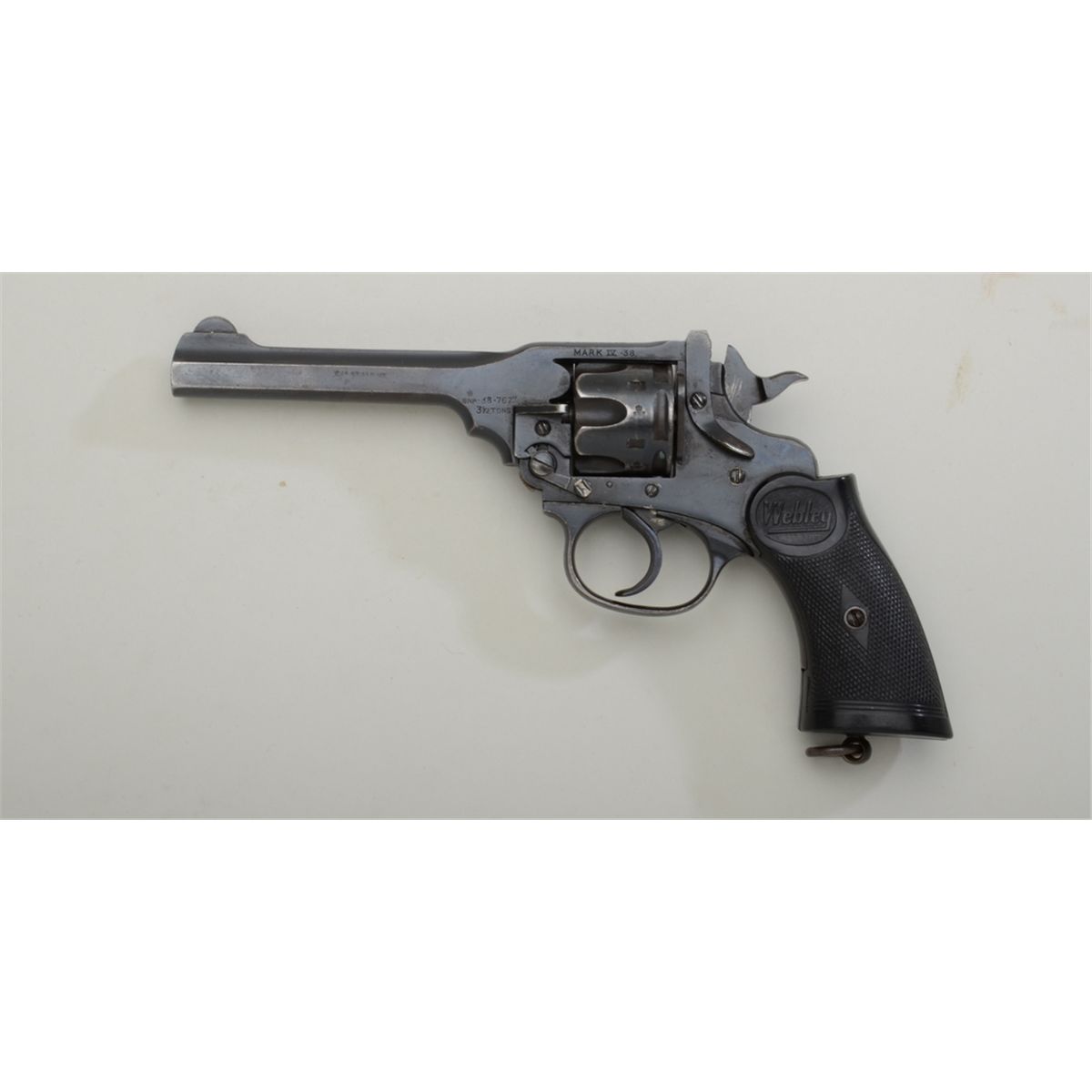 Webley Mark IV DA top break military revolver, .38 cal., 5” barrel, black finish, import-marked, checkered black hard rubber grips, lanyard ring, #A91115. This gun is in overall very good to fine condition showingthe majority of its military black finish, very good bore, action, markings (including British proofs) and grips that are painted on the butt with the number “48” in red. Est.: $150-$300.