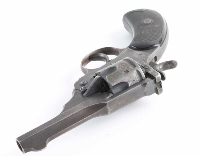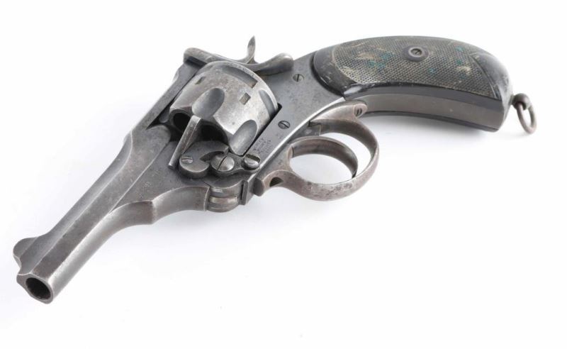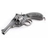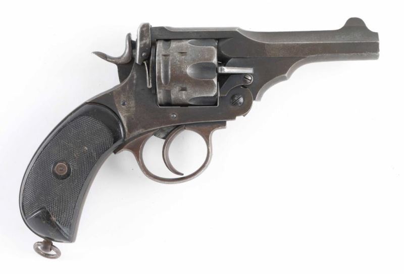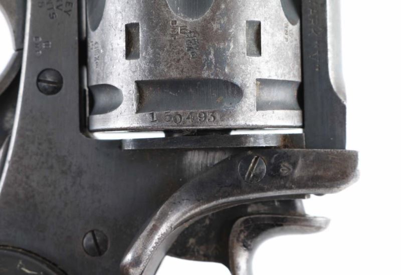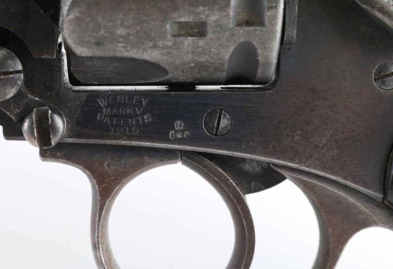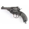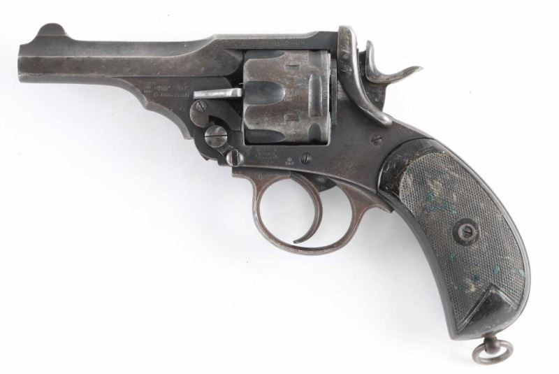 British WWI era military revolver features 4" slab sided barrel, 6 shot cylinder (appears uncut), break top style opening for loading and unloading, double/single action operation, fixed sights, bird's head grip with checkered gutta percha grips, lanyard ring on butt. Bore is good or better condition, a little dark with crisp rifling. Cylinder charge holes are good condition. Retains 20% blue, retained in protected areas, with majority of metal showing brown or gray color, some bare metal visible on edges, some patina visible throughout. Grips are good condition, solid with many scratches, appear very dark brown or black in color, slight shrinkage. Action operates smoothly and locks up tight with very little play in cylinder. Markings are generally sharp & readable, include 1915 patent date, nitro proof marks. Condition is NRA Good++ *** C&R Firearm ***