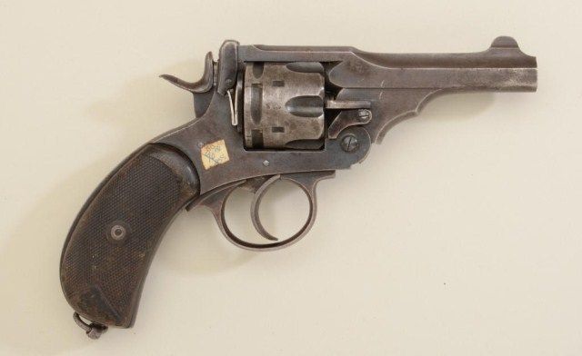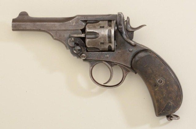 Webley Mark V DA top break revolver, .455 cal., 4” barrel, blue finish, checkered hard rubber grips, #140098. This gun is in overall good to very good condition showing traces of military blue finish, very good bore,action and markings, grips are fair and not exactly fitting this gun, lanyard ring present. Est.: $300-$500.