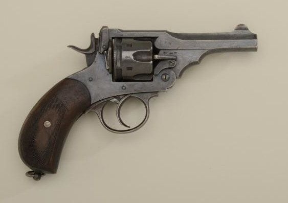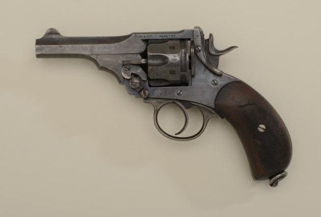 Webley Mark V DA top break revolver, .455 cal., 4” barrel, blue finish, checkered wood grips, lanyard ring, #131181. This gun is in overall very good condition showing considerable blue finish, crisp action, fairbore that may clean to good; good markings, worn grips. Est.: $150-$300.