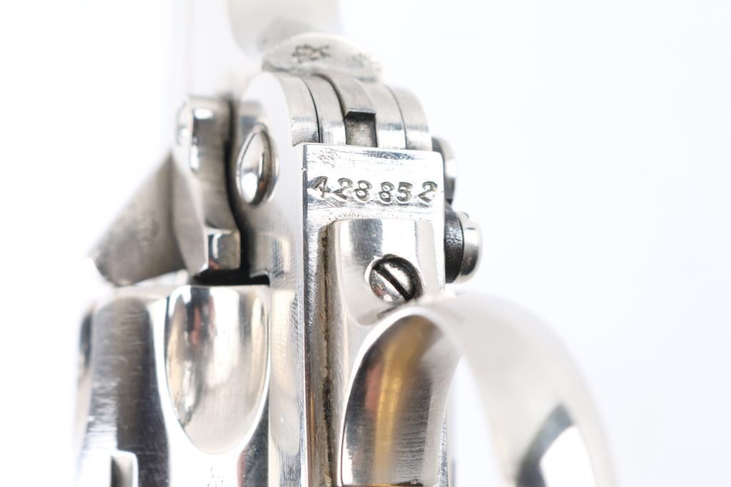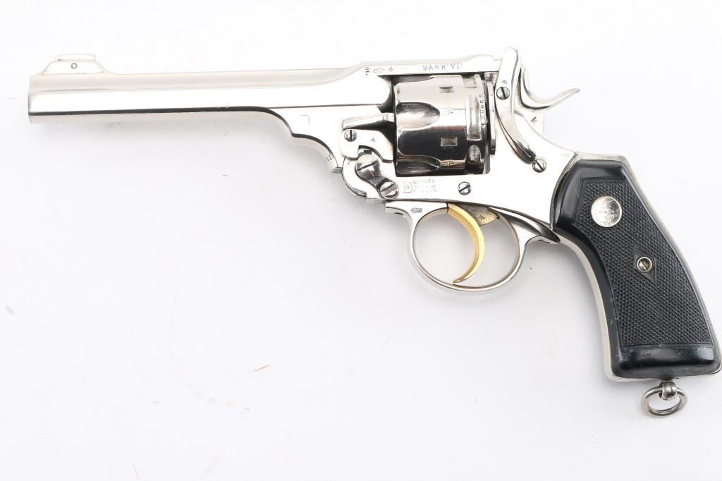 Refinished in nickel. Missing barrel top latch spring. "Shaved Cylinder". Will accommodate .45 Acp. cartridges with Half-moon clips. Break-top. WWI Era British military top-break double action service revolver. Non-import marked . Matched SN on barrel/frame. Brass trigger. The last of the large frame, big bore Webley's. Produced 1887-1923. 11 1/4" overall, with a 6" barrel. Numerous British proofs present. Lanyard ring. Bright nickel metal refinish , with replaced Franzitre black plastic, checkered grips. Action is crisp/tight. Bore very good with strong rifling. Cylinder chambers are very good. grips are very good. Markings are still crisp/clear.