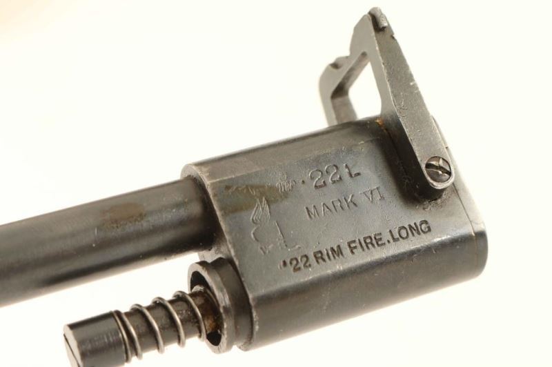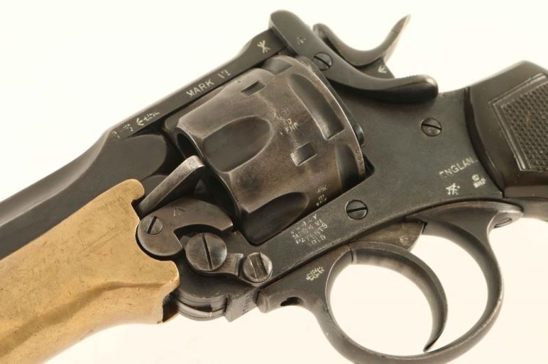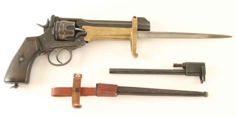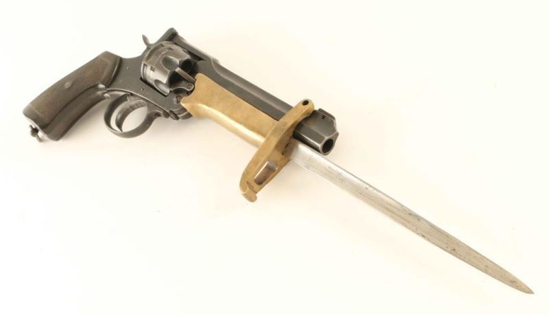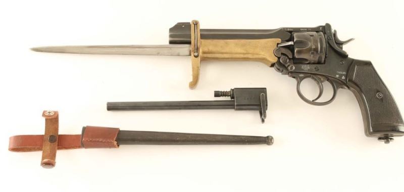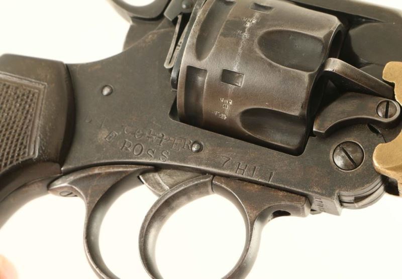 WWI Era British military top-break double action service revolver chambered for .455 Webley, dated 1915. Features a blued finish, 6" barrel, reproduction bayonet & scabbard, patridge front sight, notched rear sight on the barrel catch, 'shaved' six shot cylinder that measures 1.446" long, square-butt frame with lanyard ring, and two-piece diamond checkered hard rubber grips. The frame is stamped "LT E ROSS" & "7H1.1" with "COWPER' lined-out, and is also marked "ENGLAND" & stamped with English proofs The serial numbers match on the frame, barrel and cylinder. Includes a single shot .22 Long conversioin unit marked ".22 L/MARK VI/.22 RIM FIRE LONG", [W&S bullet logo], "2146" & "WEBLEY & SCOTT LTD/LONDON & BIRMINGHAM." The revolver exhibits approximately 60% of it's blued refinish showing holster wear, thinning and some pin prick pitting under the finish. Action is sound with good lock-up, bore is pristine, markings are very good and the hard rubber grips are very good with minor losses. Condition is NRA Good. ***C&R Firearm*** From The John F Sukey Collection
