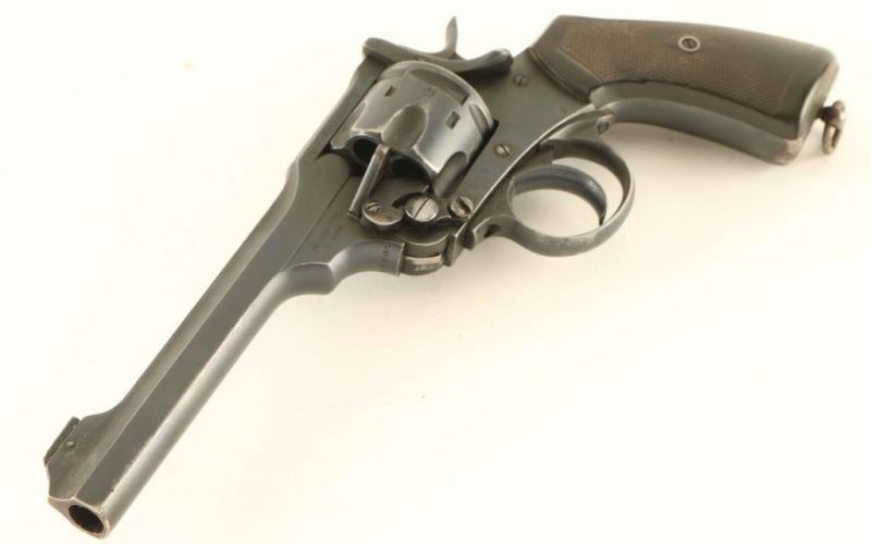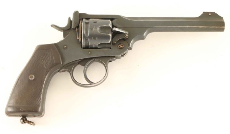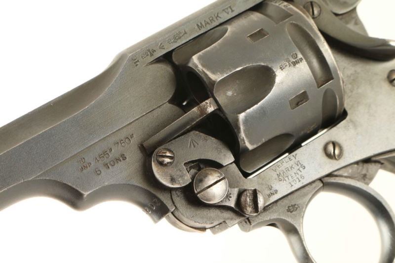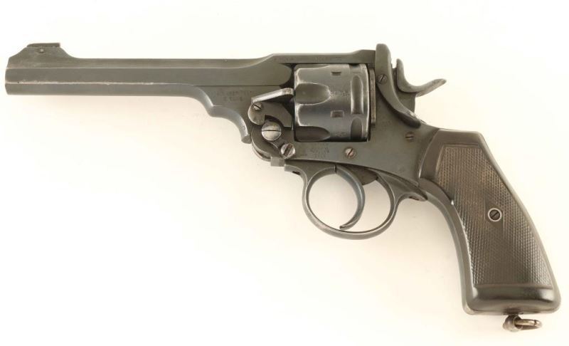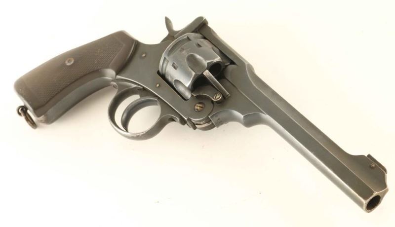 WWI Era British military top-break double action service revolver chambered for .455 Webley, dated 1916. Features a blued finish, 6" barrel, pinned patridge front sight, notched rear sight on the barrel catch, unaltered six shot cylinder that measures 1.498" long, square-butt frame with lanyard ring, and two-piece diamond checkered hard rubber grips. The serial numbers match on the frame, barrel and cylinder & the frame is stamped with English proofs marks. The revolver exhibits approximately 90% of it's blued refinish showing light holster & handling wear. Action is sound with solid lock-up, bore is pristine, markings are clear and the hard rubber grips are good with semi-worn checkering & a crack in the bottom of the right panel. Condition is near NRA Good. ***C&R Firearm*** From The John F Sukey Collection