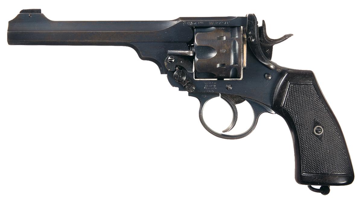 Produced in 1918, this revolver is fitted with blade front and fixed notch rear sights, and marked with a number of military "broad arrow" proofs and other proofs on the top strap, between the chambers, frame and trigger guard. Matching serial numbers on the frame, cylinder, and barrel. "WEBLEY / MARK VI / PATENTS / 1918" on the left side of the frame, checkered square butt grips and a lanyard swivel. With a 1917 dated leather holster.