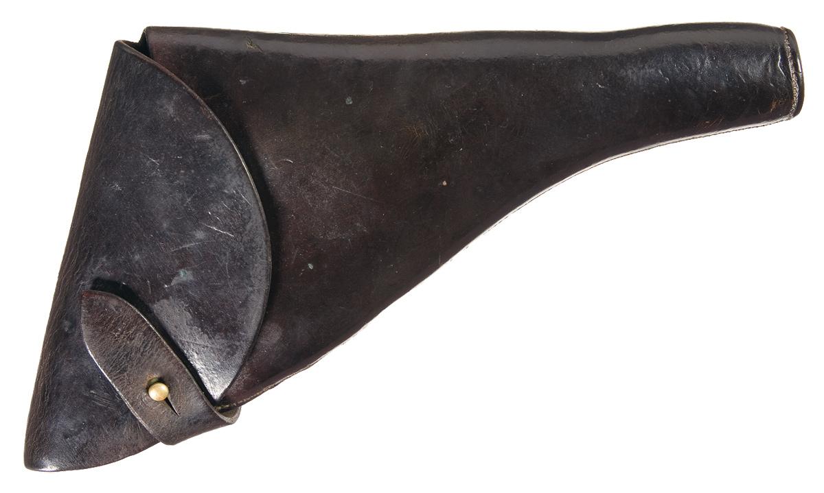 Condition: Excellent. The revolver retains approximately 90% original blue finish with the balance a smooth brown patina. The grip straps have a smooth brown patina and there is some minor pitting mostly on the cylinder. The grips are excellent with some scattered minor handling marks and some mild wear in the overall crisp checkering. The holster is very good with minor flex wear. The stitching is tight.
