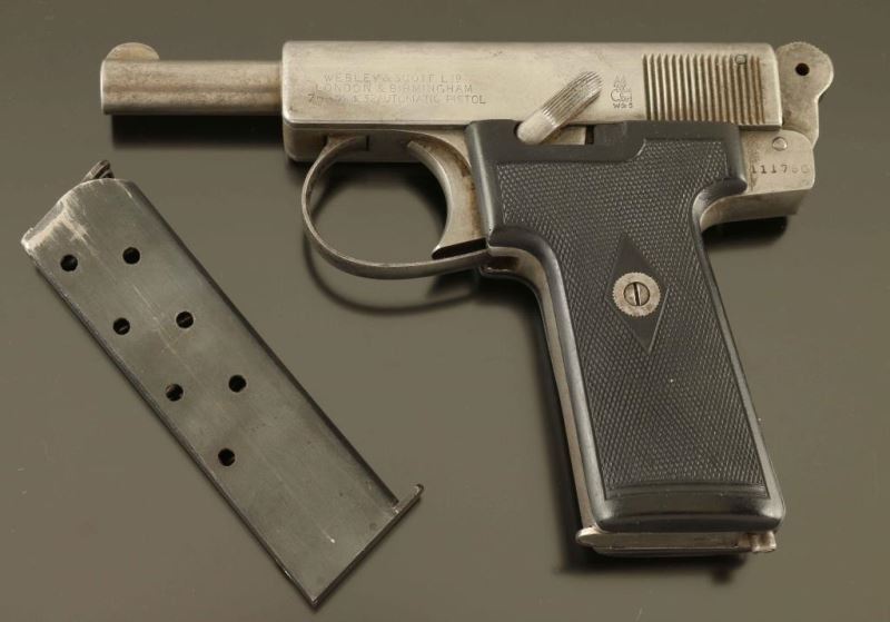 English made blowback operated semi-automatic pistol chambered in 7.65mm, manufactured circa 1908-WWII. Features a nickel plated finish, 3.5" barrel, round blade front sight, 'v' notched rear sight, smooth trigger, manual safety, serrated round hammer spur, push button magazine release, 8 round magazine, release manual safety and two-piece black hard rubber grips with diamond checkering. The serial numbers on the frame, barrel & slide are matching. Includes a spare magazine. The pistol has very little remaining finish with the majority of the metal surfaces in-the-white. The slide shows some blooding type erosion and the recoil spring appears under powered as the slide when pulled rearward will not return to battery without assistance. Spring issue aside the pistol appears mechanically sound, the bore is very good with a small amount of surface rust towards the muzzle, markings are clear and the hard rubber grips are very good & are possibly reproduction. The slide rubs along the tops of the grips which also contributes to the slide not returning to battery once pulled back and released. Condition is NRA Fair. ***C&R Firearm*** From The John F Sukey Collection