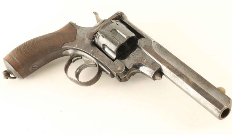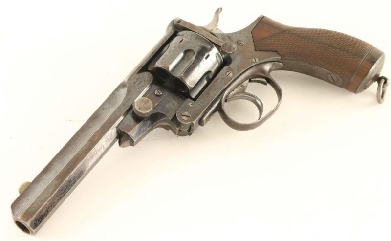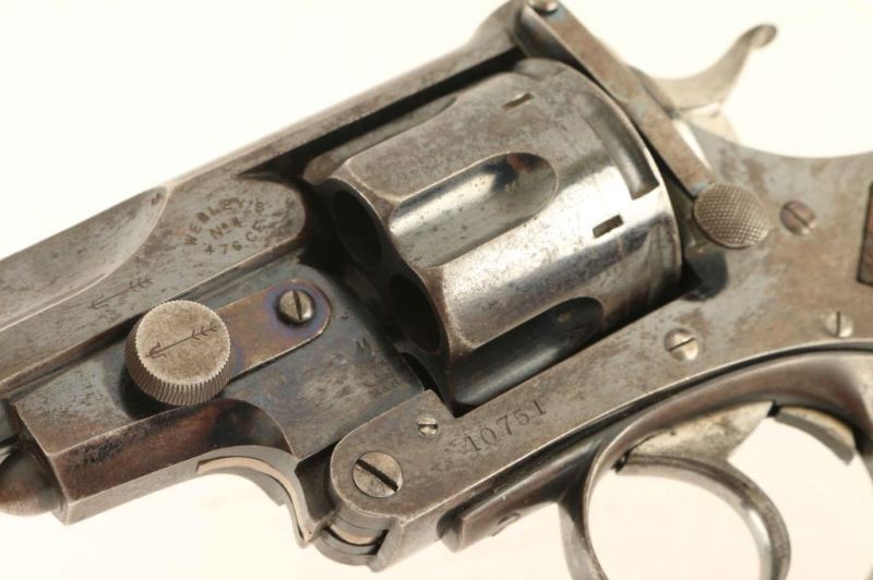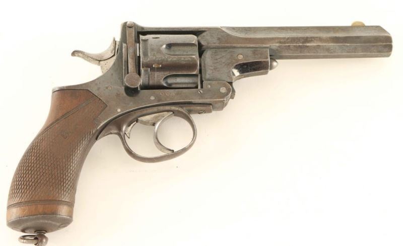 English made Pryse pattern top-break double action revolver chambered in .476 Center Fire. Features a bright blued finish, 5.5" bbl, German silver round blade front sight, 'v' notched rear sight, fluted six-shot cylinder, automatic extractor, rounded trigger, knurled hammer spur, lanyard ring and one-piece checkered walnut wrap-around grip. Markings: Barrel - "WEBLEY'S/No4/.476 CF" & [winged bullet]/"W&S. Revolver retains approximately 65% of it's original high polish blued finish showing holster & handling wear with brown patina making up the balance. Action is smooth with solid lock-up, the bore is near excellent with a small amount of pitting or rust near the center of the barrel, markings are crisp and the wood grip is very good+ with worn points & an illegible stamp on the right side. Condition is NRA Fine. ***Antique Firearm*** From The John F Sukey Collection