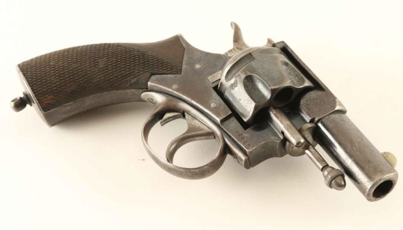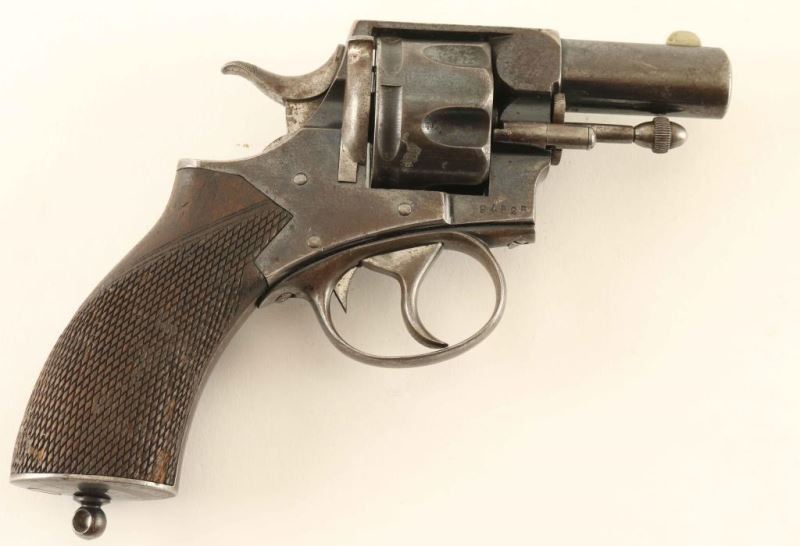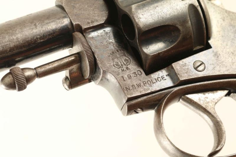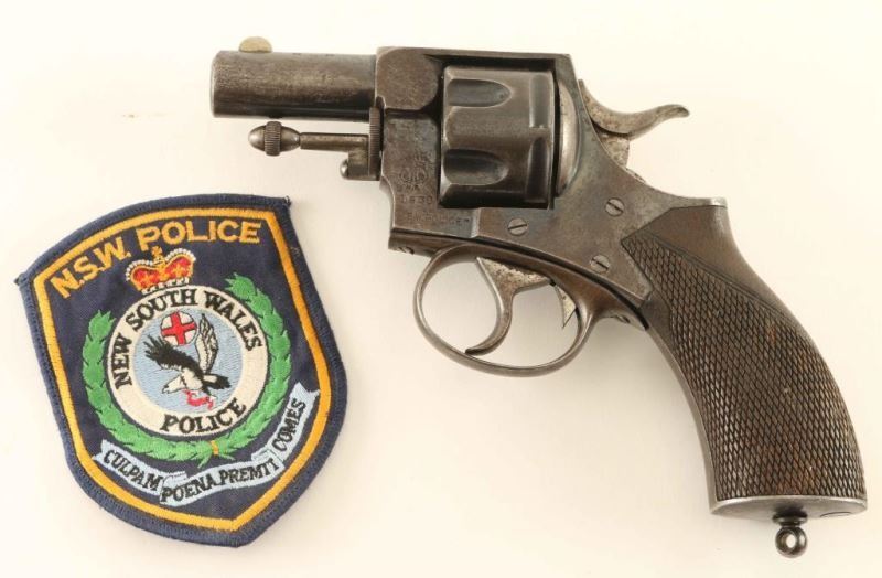 'Metropolitan Police' New South Whales marked solid frame double action revolver chambered for .450 Adams. Features it's original blued finish, 2.5" bbl, German silver round blade front sight, 'v' notched rear sight, fluted six-shot cylinder, pivoting loading gate, swing-out ejector rod, rounded trigger, knurled hammer spur, and one-piece checkered wood wrap-around grip. Serial numbers on the frame & cylinder are matching. Markings: Top Strap - "P. WEBLEY & SON" & "LONDON & BIRMINGHAM," Left Side of the Frame - "WEBLEY'S[shackled hands]M.P.," "1930" & "N.S.W. POLICE." Includes a N.S.W. Police patch. Revolver retains approximately 40% of it's original bright blued finish with the remainder of the metal surfaces displaying an aged grey/brown patina. Action is sound with very good lock-up, bore is very good+ with some light rust towards the muzzle, markings are good+ and the wood grip is good with wear & small losses. Condition is NRA Fine. ***Antique Firearm*** From The John F Sukey Collection