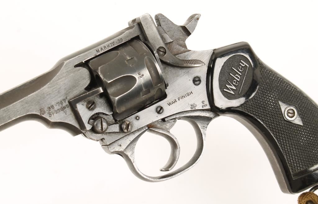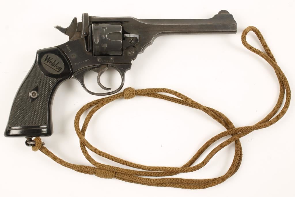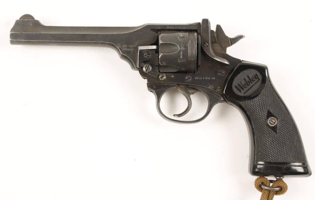 Blued double-action 6-shot top-break revolver with a 5" barrel. Marked "WAR FINISH" and "ENGLAND". Finish has edge wear. Black plastic grips have "Webley" on them. The bore is bright with good rifling and the chambers are shiny. The grips are in very good condition. Includes a braided lanyard with a sliding Turk's head keeper. Condition is very good. *Modern Firearm*