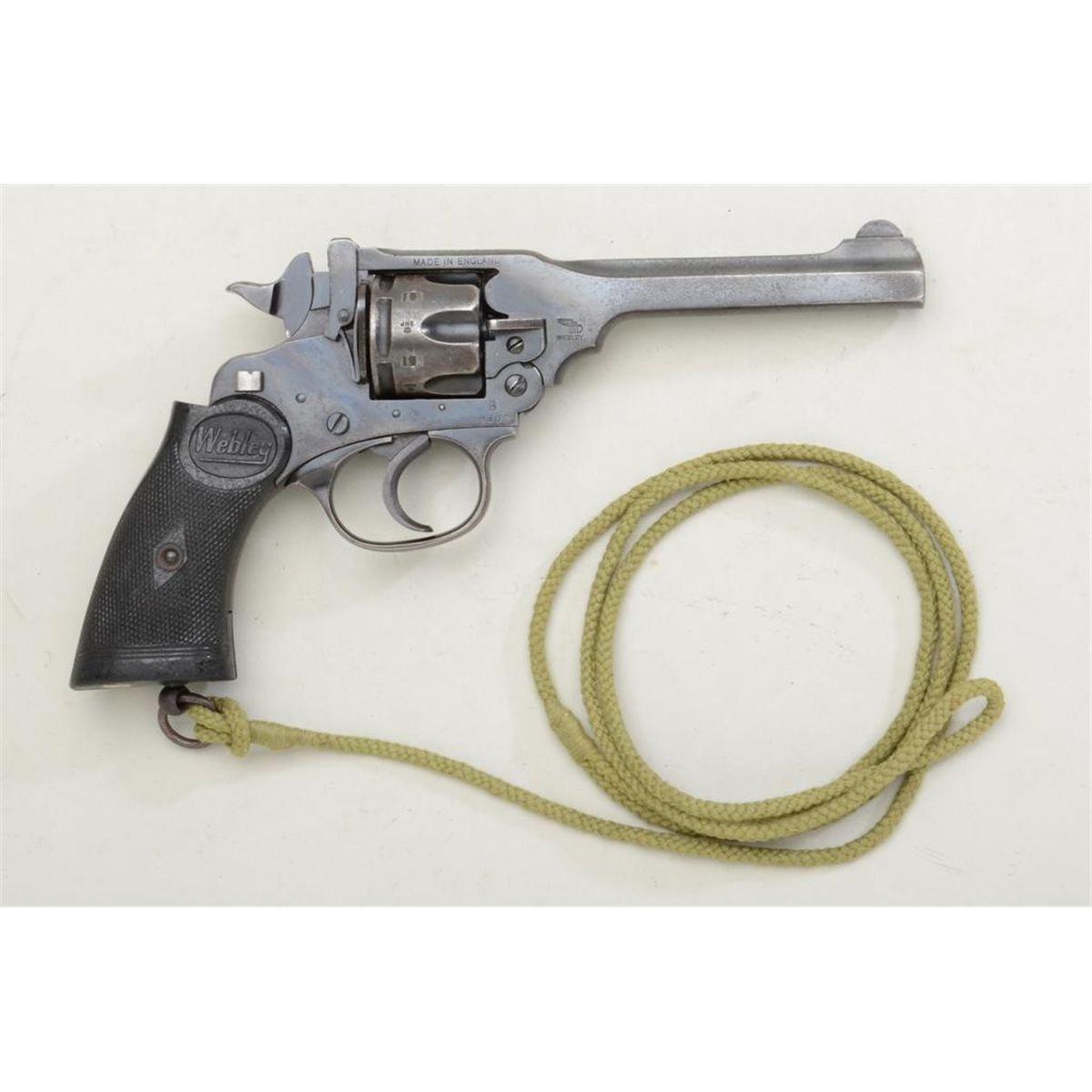 Webley & Scott Mark IV DA top break revolver, .38 cal., 5” barrel, blue finish, checkered hard rubber grips, woven lanyard, #B 9403. This gun is in overall very good to fine condition showing approx. 75% originalfinish, fine bore, action and markings including British proofs, very good grips with white painted numbers “1518” and “13” on the bottom of the grips. Est.: $150-$300