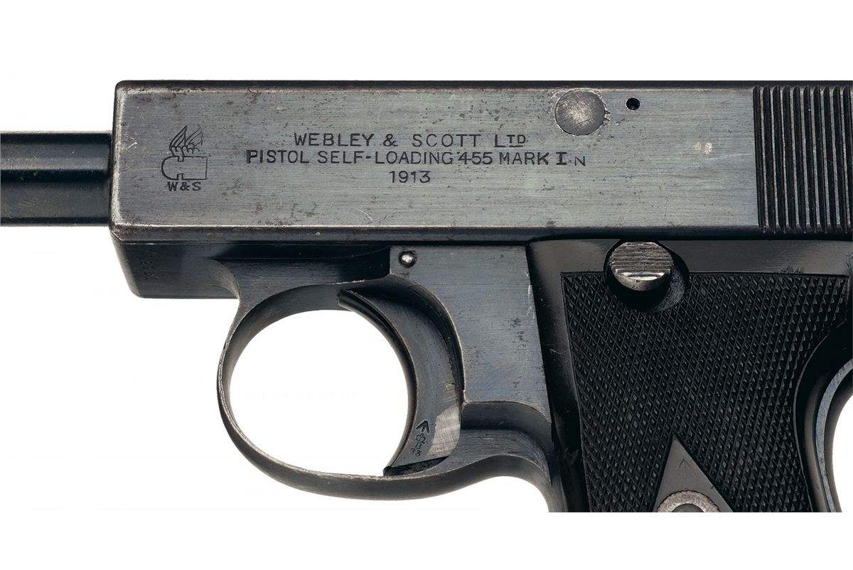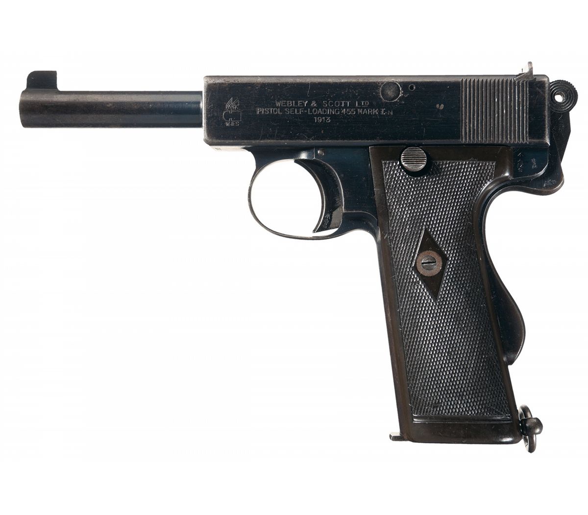 Blade front and windage adjustable rear sights, with the winged bullet logo next to "WEBLEY & SCOTT LTD/PISTOL SELF-LOADING 455 MARK 1 N/1913" on the slide, "'13" on the right side of the frame, and a combination of martial and civilian proofs. Checkered grips, with a lanyard ring on the back strap.