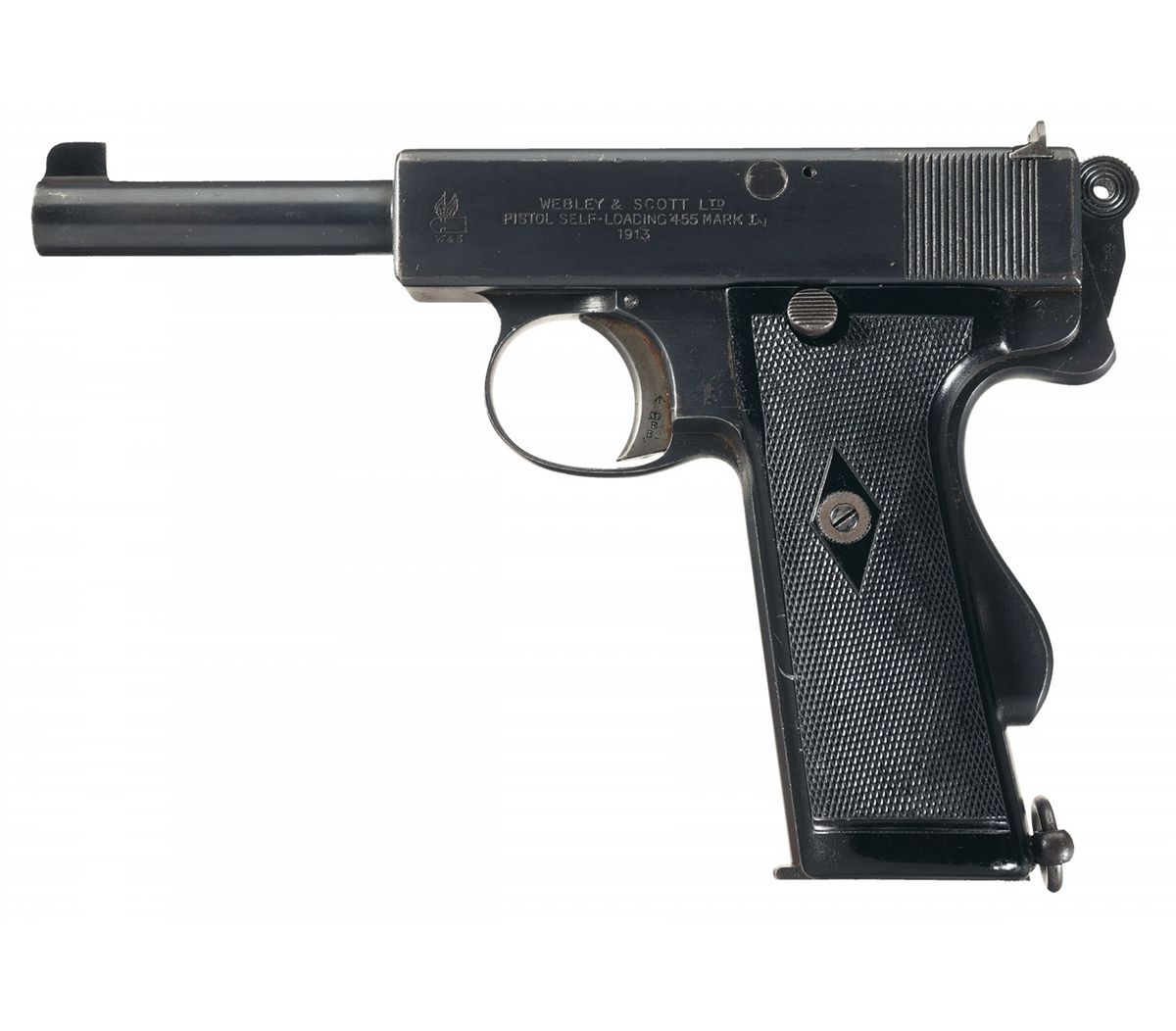 The Model 1913 MK1N was adopted by the Royal Navy. Blade front and windage adjustable rear sights with the left side of the slide marked with the winged bullet logo next to "WEBLEY & SCOTT LTD/PISTOL SELF-LOADING 455 MARK 1 N/1913". There are various British proofs and a lanyard ring on the back strap. Fitted with checkered grips.