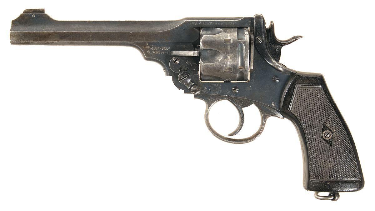 Manufactured between 1915 and 1928 with British proofs on left side of barrel, frame, cylinder and trigger guard. Left side frame dated "1918" with matching visible numbers.