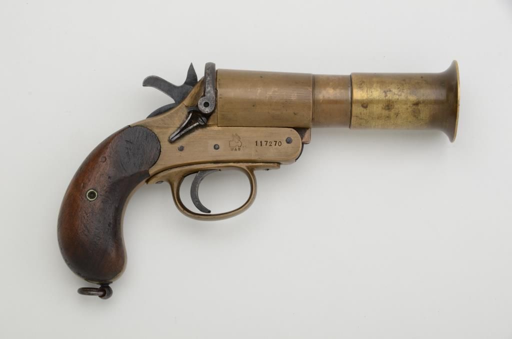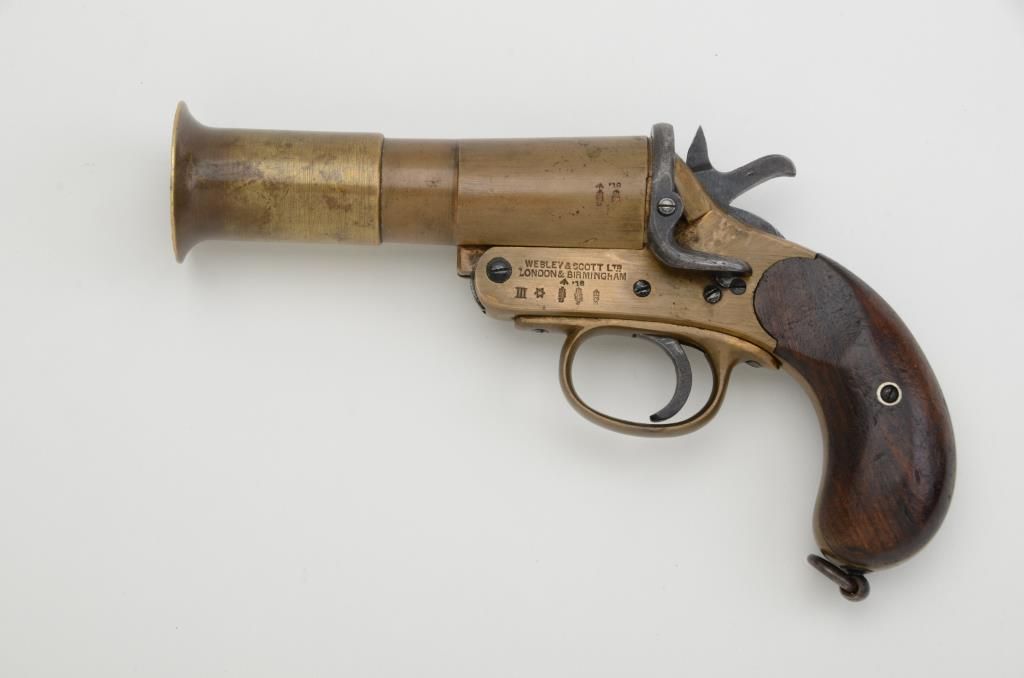 Webley & Scott No. 1 Mark III Flare pistol with 1942-dated tan web holster and shoulder strap, 25mm cal., 5-3/4” flared barrel, brass construction, walnut grips, English proofed, #117270 in overall good condition; holsterin very good condition. Est.: $150-$300.