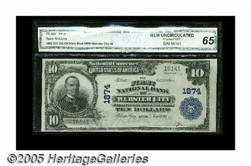 <B>Webster City, IA</B></I> - $10 1902 Plain Back Fr. 628 <B>The First NB</B></I> Ch. # 1874<BR><B>CGA Gem Uncirculated 65.</B></I> A fresh-appearing note signed by the Vice President.