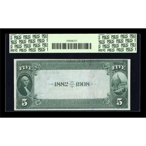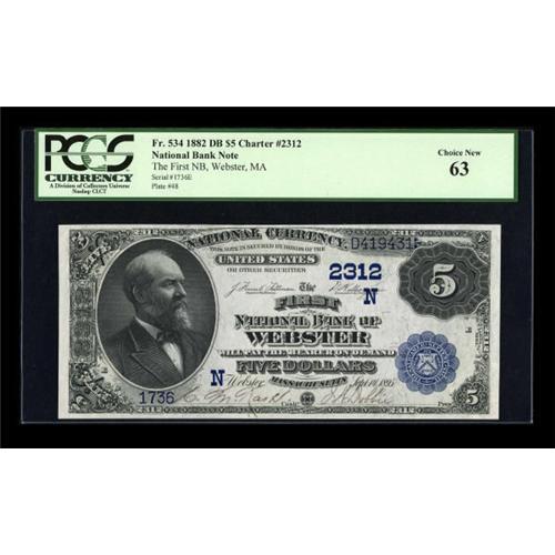 <B>Webster, MA</B></I> - $5 1882 Date Back Fr. 534 <B>The First NB</B></I> Ch. # (N)2312<BR> A lovely 1882 $5 Date Back which is perfect for any high end type or state set. PCGS <B>Choice New 63,</B></I> with clear signatures and bright white paper. <BR><I>From The Thomas M. Flynn Collection</B></I><BR><BR><b>Shipping:</b> Coins & Currency (<a target="_blank" href="http://www.heritageauctions.com/common/shipping.php">view shipping information</a>)