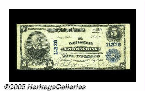 <B>Webster, MA</B></I> - $5 1902 Plain Back Fr. 606 <B>The Webster NB</B></I> Ch. # 11236<BR>Although the bottom margin is a bit tight on this <B>Very Fine</B></I> example, the officers' signatures are dark and legible. This institution was chartered in 1918 and failed in 1933, issuing only the $5 denomination in Plain Backs and 1929 Type 1 and 2. Just $2,470 of its large circulation remained available to the public when it closed.