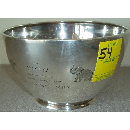 Webster Sterling Bowl with Elephants dated Nov. 6th 1956 to HFS in Grateful Appreciation ~7" diameter x ~ 4 1/8" tall