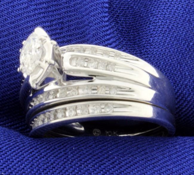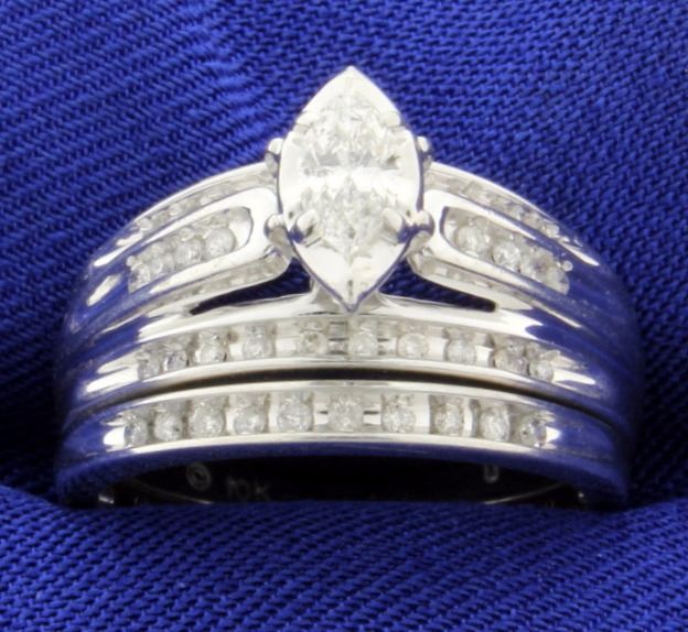 In 10K white gold, the center diamond is a 1/4ct marquise diamond that is I clarity/H color. It is surrounded by thirty eight .01ct diamonds of similar quality. Size 7 5.5g