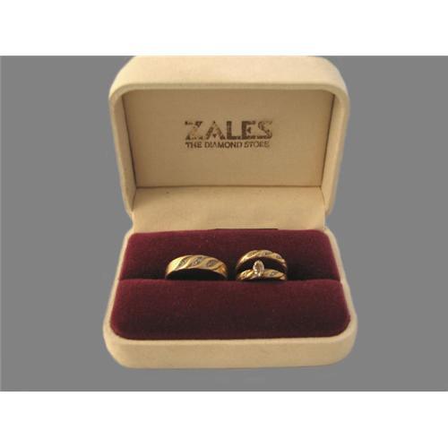 From Zales Jewelers is this bridge and groom wedding set in 10K SWG. The center marquis stone of the engagement ring is missing and would need to be replaced and there is a chip diamond on each side of the center. Both wedding bands have 3 chip diamonds. The man's ring is a size 8-1/2 and the woman's is 4-1/2.