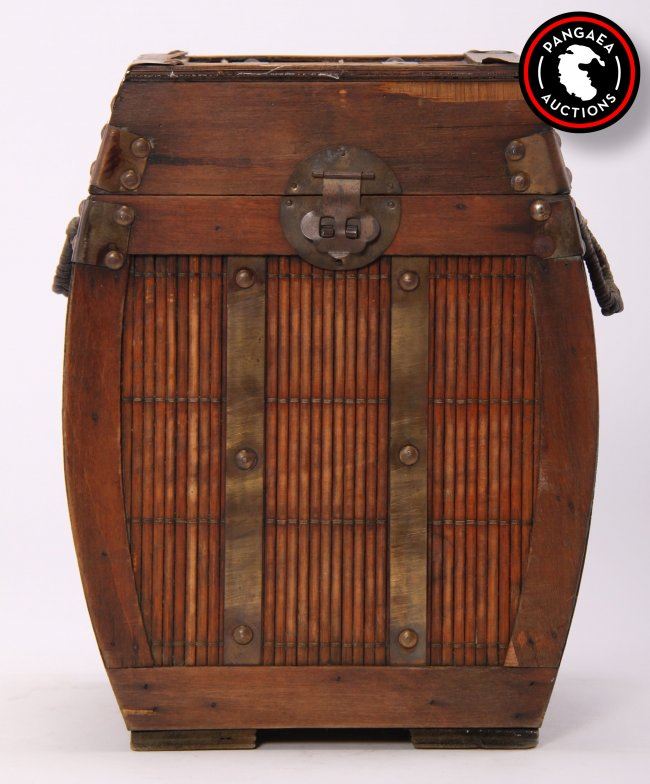 Wedding basket with bamboo facade and brass hardware. SIZE: see attached ruler photo. Photos are part of the description representing the condition report and can be used for authentication prior to the auction date. Pangaea Auctions urges Bidder's to view all attached photos in detail. #(American, Antique, Decorative Art, Chest/Basket, Wood, , Bamboo)